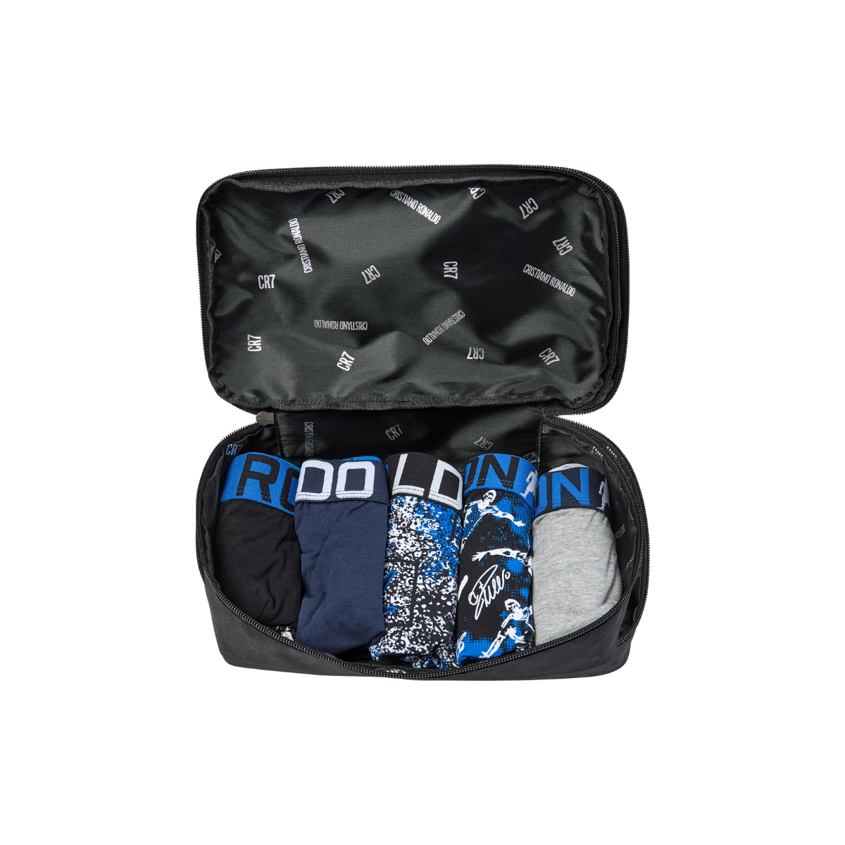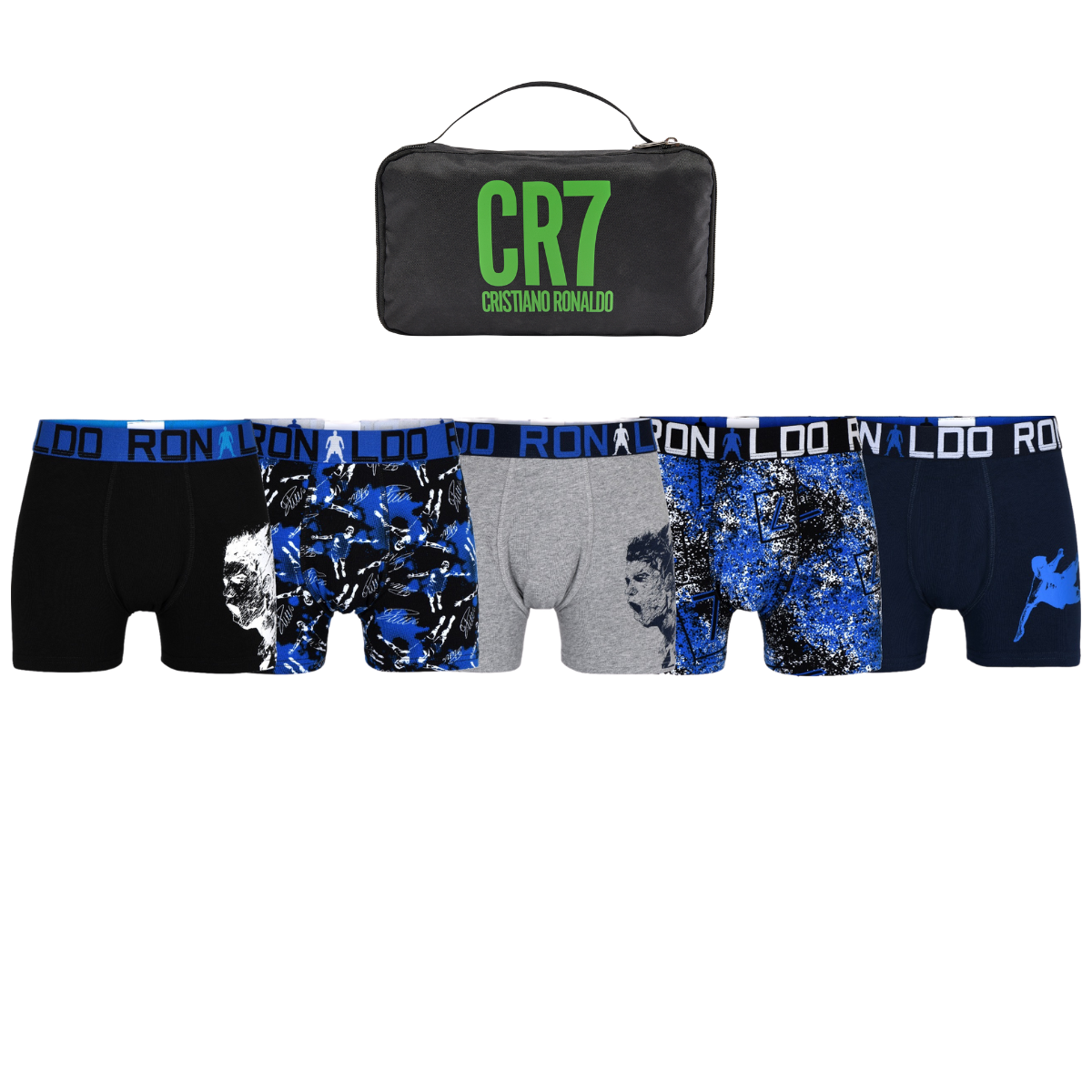 Cristiano Ronaldo's CR7 Underwear for boys. These value 5-pack cotton blend trunks come with a convenient zip travel bag, great for keeping stuff organized from practice, school and sleepovers.