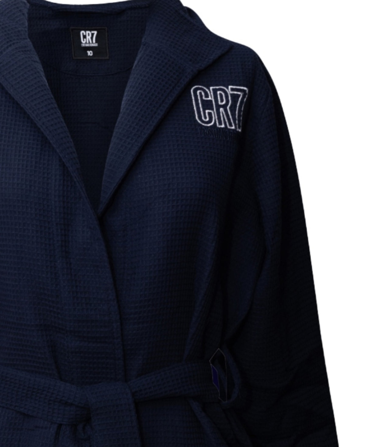CR7 Boy's cotton blend waffle weave bathrobes are warm and absorbent for bath time. Robe features white 'CR7' logo on left chest.