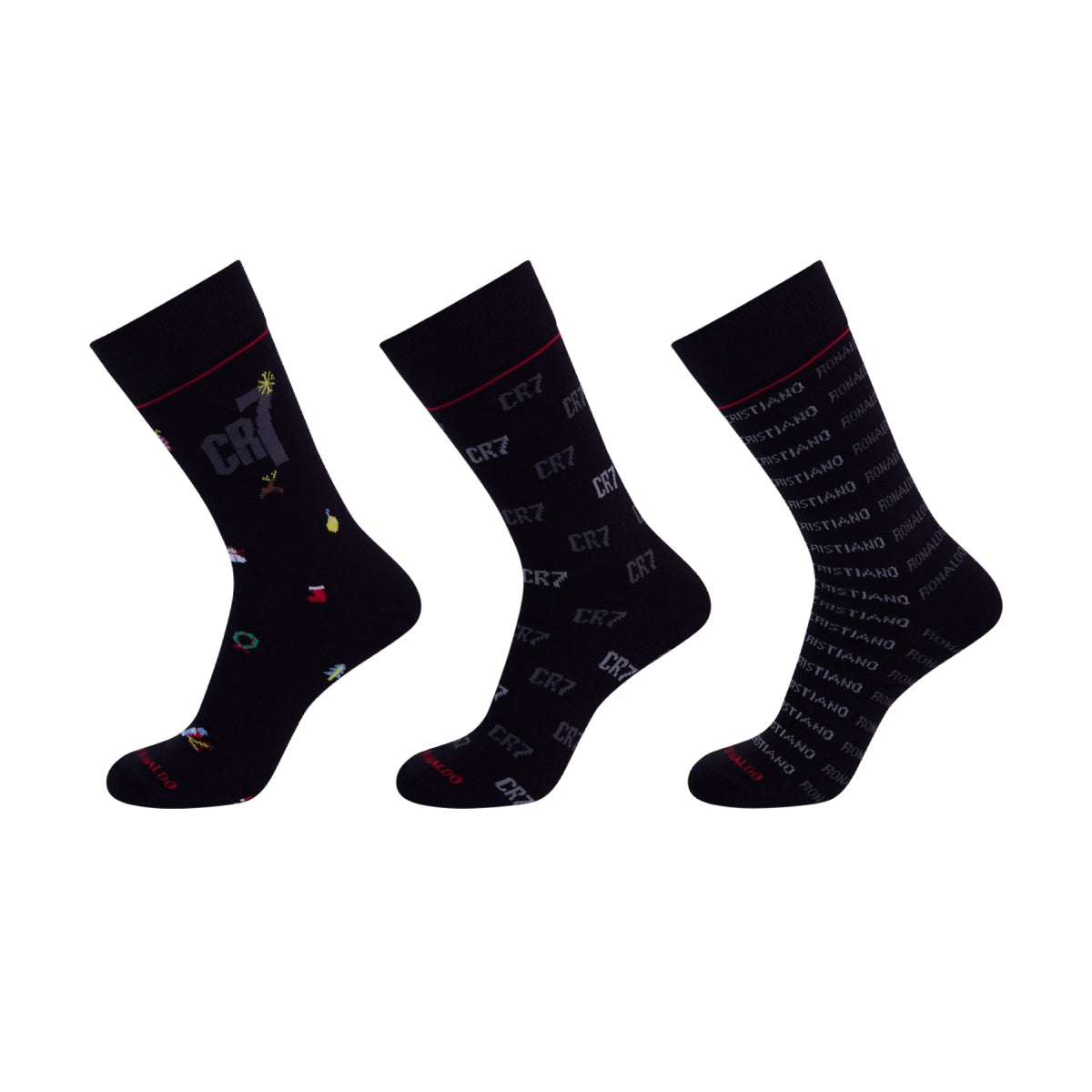 Holiday spirit, from head to toes! This 3-pack gift-box includes black Cristiano Ronaldo crew socks. (1) pair is embellished with holiday adornments while (2) pairs feature Cristiano's name and brand logo in muted white, grey and red accents.